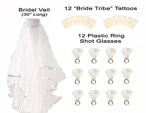 - ★ EVERYTHING YOU NEED FOR MEMORIES TO TREASURE: We know how special you want to make her final night of freedom, and that’s why we have the ultimate bachelorette bundle for you. Including 1 White Veil, 12 Shot Glass Rings, and 12 “Bride Tribe” tattoos. Everything you need celebrate her final cocktail fuelled club-night before she ties the knot!