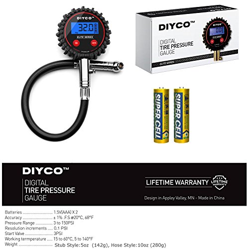 Digital Tire Pressure Gauge, 150 PSI, With Hose & Auto-Release Valve, for Car Suv Truck Bicycle and RV, Professional-Grade High Accuracy Gauges, Design in USA by DIYCO - Gen-2