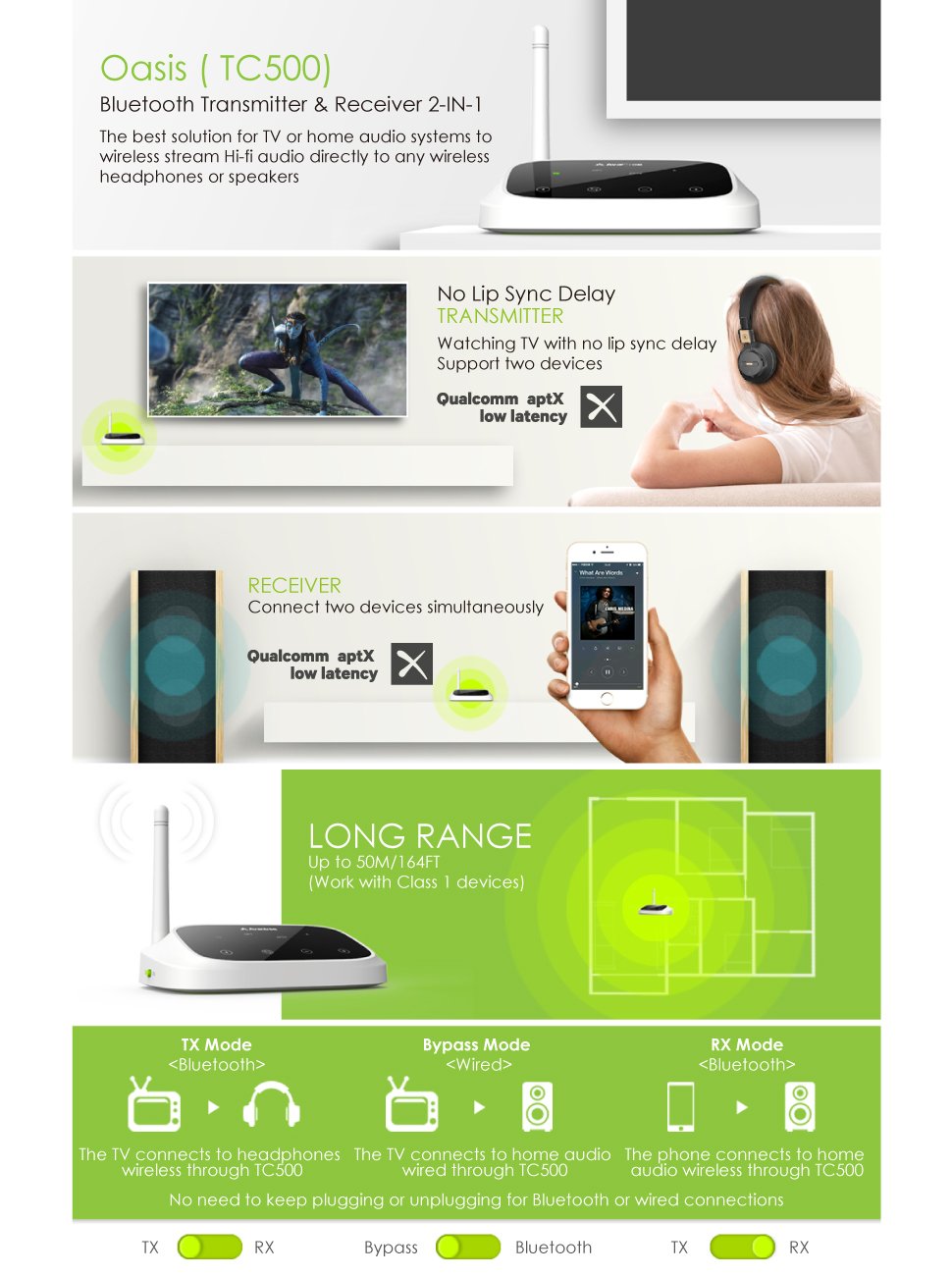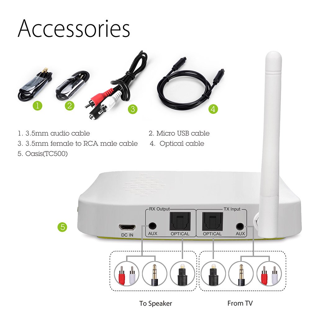With the long range audio transmitter & receiver "Oasis" utilizing state-of-the-art low-latency technology "aptX Low Latency", you can enjoy high quality sound with low delay and real CD quality.
