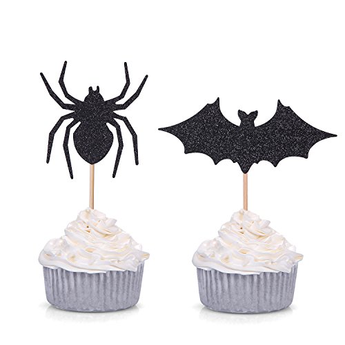 Set of 24 Black Spider and Bat Cupcake Toppers Halloween Party Picks - by Giuffi