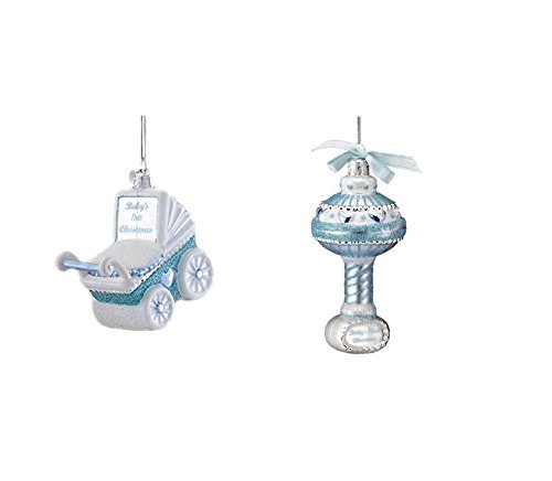 Kurt Adler Noble Gems, Baby Boy 1st Christmas Ornament Set, Rattle & Pram