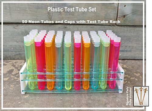 Test Tube Party Pack, 50-Hole Rack with Assorted Color 5" Plastic Test Tubes and Caps w/Bonus FDL Picks