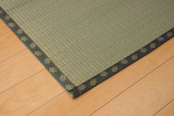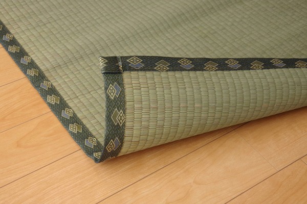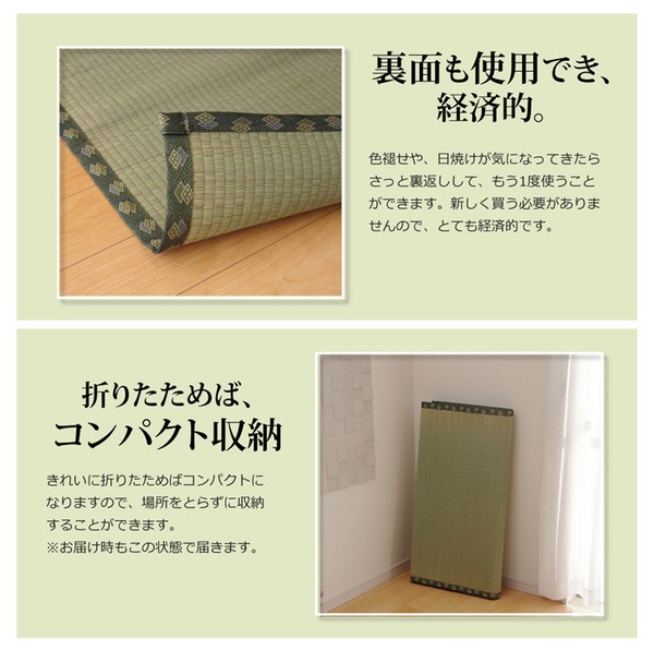 上敷きを敷くだけで畳のお部屋をリフレッシュ出来ます。日焼けしてしまった畳のリフレッシュに、新品の畳を汚さないためのカバーにご使用下さい。長さ110~115cmの国産(九州産)い草を使用しています。そのうち約92cmを使用しています。ヘリ際はある程度白みを帯びます。(日焼けではありません、い草の根元と先端部分の色です。)い草は長いものほど高級になります。い草は先端部分が赤茶色く、根元が白く真中が青(緑)色です。真中の良質な青の部分を多く使用するほど、丈夫で綺麗な仕上がりとなります。またイ草は使用するうちに日焼けをしますが、真中の青の部分を多く使用したものほど、全体が綺麗にムラなく日焼けし、味が出ます。国産(九州産)のい草を使用しています。国産い草は一本一本が太く、表皮が厚く繊維がキメ細かいので弾力性があり、耐久性に優れています。い草には空気の清浄化作用、湿度の調節作用があり、汚れにくいといった特徴があります。い草に青森ヒバ加工を施しています。(抗菌、防臭効果)表裏の両面が使えて経済的です。