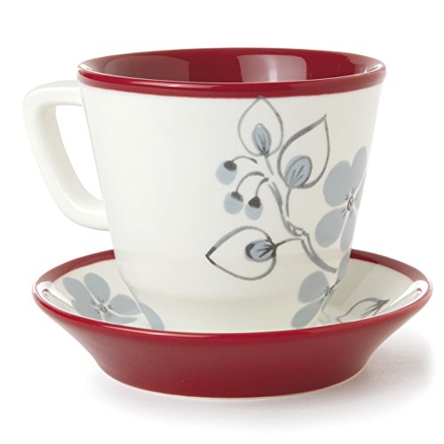 Product Description Deep red trim beautifully sets off the delicate gray and black dogwood flowers on this cup and saucer set. Treat yourself, or surprise a fellow tea drinker with a gift. 0