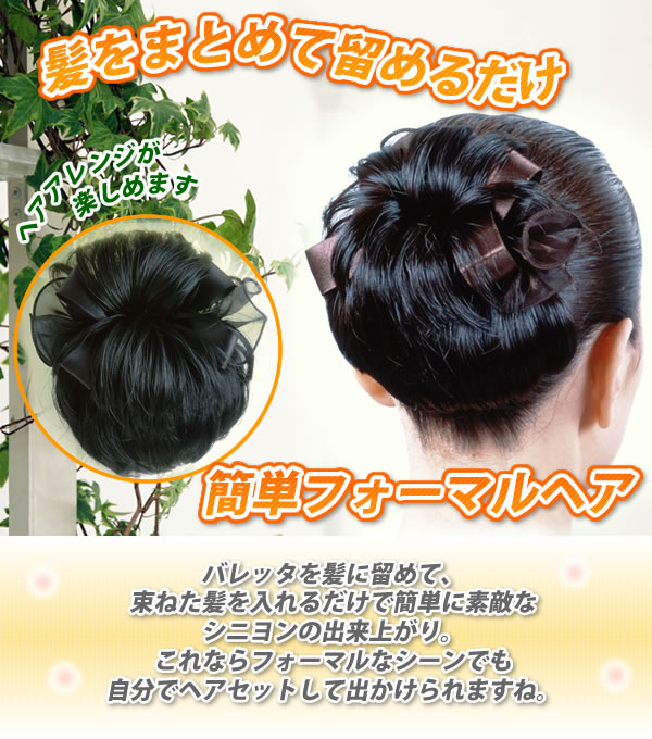 バレッタを留めて束ねた髪を入れるだけで簡単に素敵なシニヨンの出来上がり。リボンが遊び心をプラスして上品な華やかさを演出します。フォーマルな場でも自分でセットして出かけられますよ。