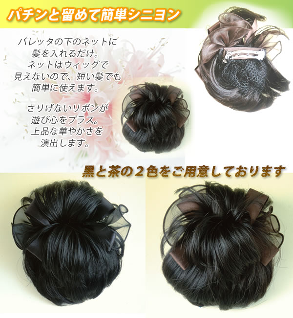 バレッタを留めて束ねた髪を入れるだけで簡単に素敵なシニヨンの出来上がり。リボンが遊び心をプラスして上品な華やかさを演出します。フォーマルな場でも自分でセットして出かけられますよ。サイズ/縦12×横14×厚さ5cmパッケージ:縦14×横11×高さ6cm ※サプライヤー直送品  ご注文後、当日~1営業日後の出荷となります【商品名】リボンつけ毛ネットバレッタ 茶