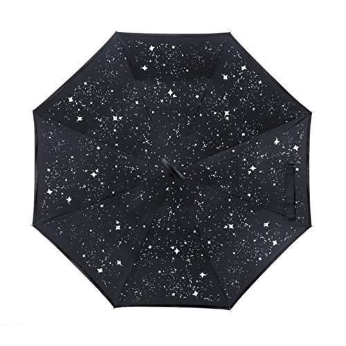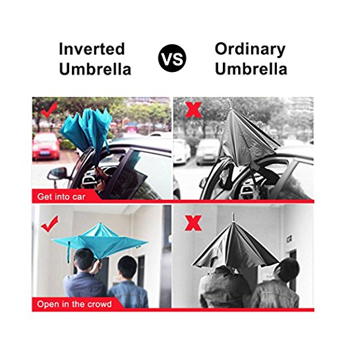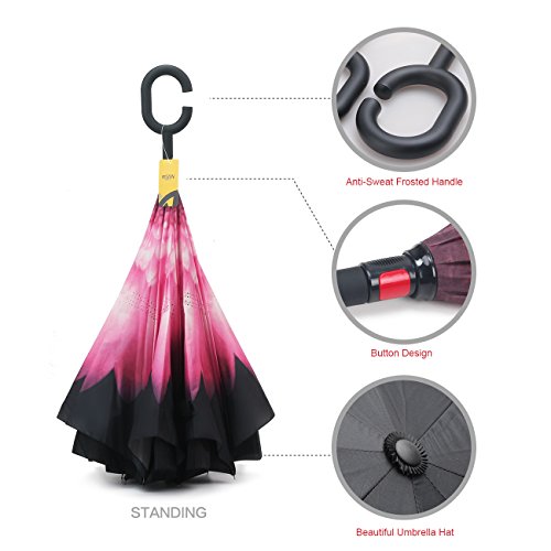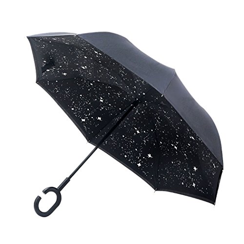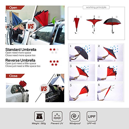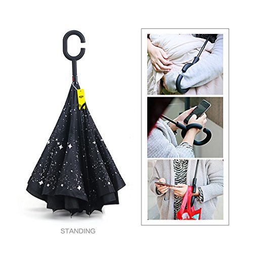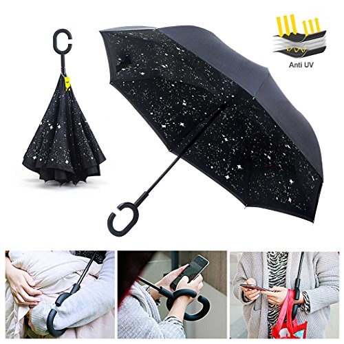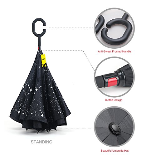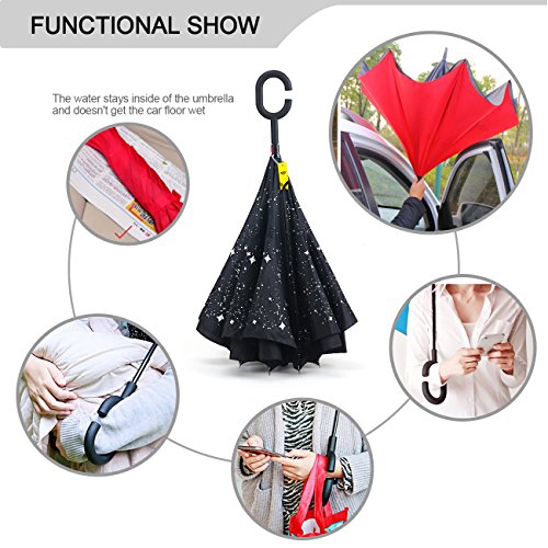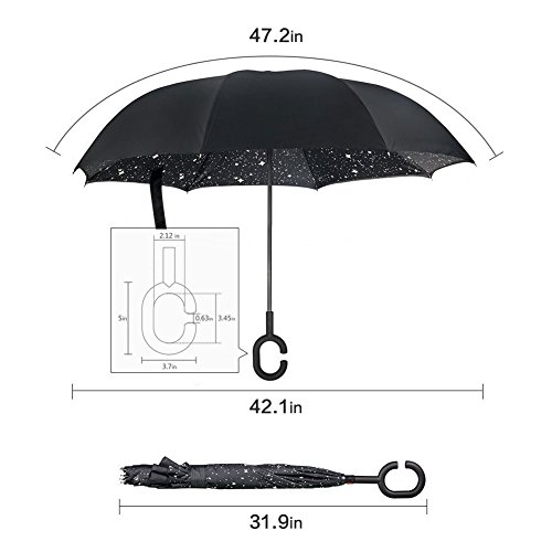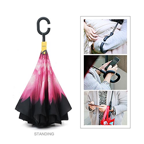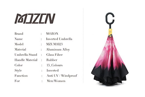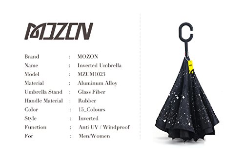 MOZON Double layer inverted umbrella * Unique design double layer inseide out umbrella, make it easy for you on raining day, won't wet your car, documents or others. * Advanced double layer ribs made the inverted umbrella more sturdy. * 23 in X 8 Panels is large enough for Many People .