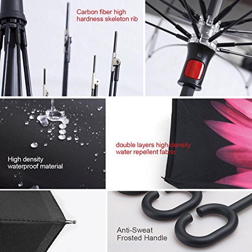 Specification: Product Name: MOZON Reverse Umbrella Fabric Material: double layers high-density water repellent fabric Rib Material: carbon fiber high hardness skeleton Handle Material: Rubberized plastic matte painting handle Control: Non-automatic Color: Red Yellow Blue Flower1 Size: 31.9* 42 inch (open status) Weight: 580g