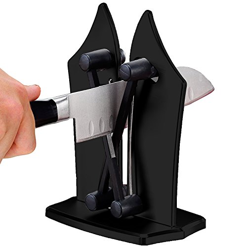 Professional Knife Sharpener: Bavarian Edge kitchen knife sharpener can make all types knives razor sharp in second unlike an electric knife sharpener or sharpening steel.Made of ultra though Tungsten Carbide Sharpener has the spring action arms that flexes and contours to any angle for razor sharp knifes.much better than a knife sharpening stone.