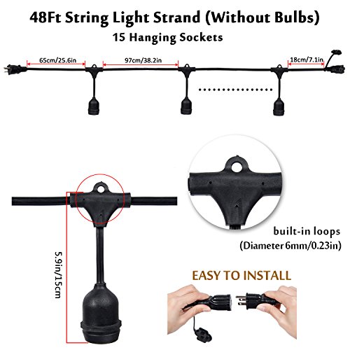 48FT String Light Strand, 15 hanging sockets, E26 Base Socket Type. Please kindly note this 15 hanging sockets strand doesn’t include bulbs.