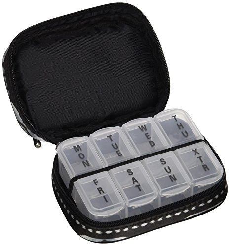 Studio : DM Merchandising Publisher : DM Merchandising Binding : Toy Product Description The fashion smart pill and Vitamin clutch helps you secure your pills with functionality! eight individual compartments let you organize for the whole week at one time, with extra space for non-daily pills. It has a classic design made in fashionable fabrics, and the interior pill holder is removable for easy cleaning. The zippered side pocket holds your medical iD and other important items. 0