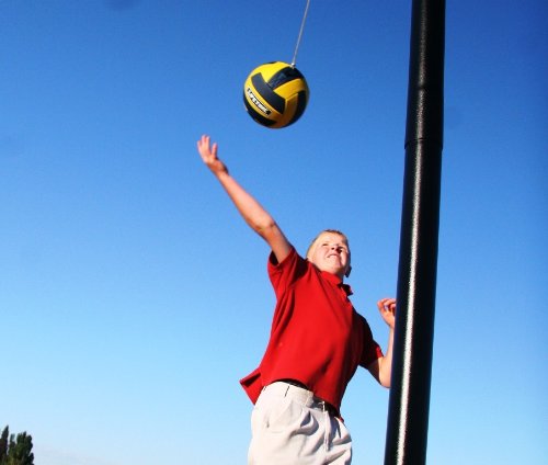 Portable tetherball system is safe for children and novices but strong enough to stand up to aggressive play