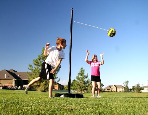 Includes: regulation-sized 8" softplay tetherball, 2" round pole, heavy-duty portable round base, pump, and needle.