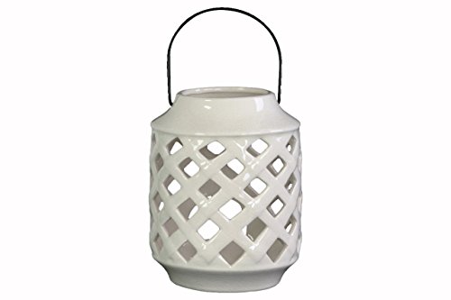 -. Title : Urban Trends Ceramic Cylindrical Lantern with Metal Handle and Diagonal Cutout Design, White