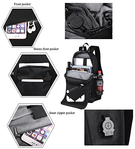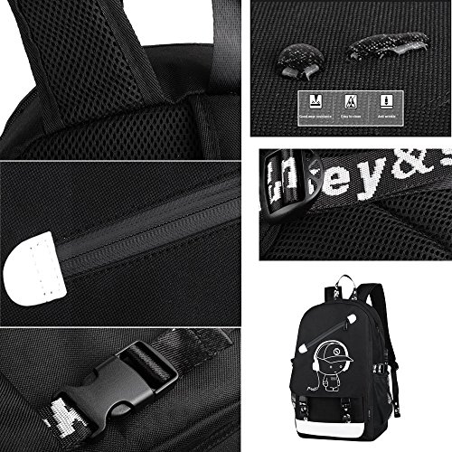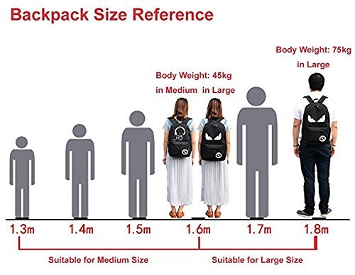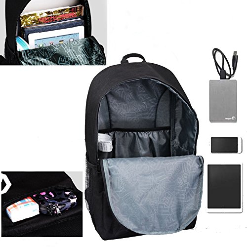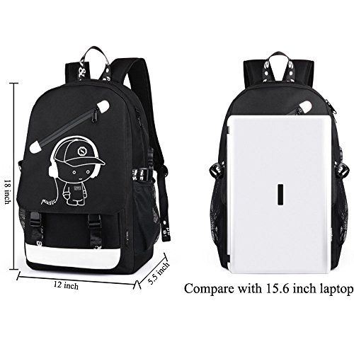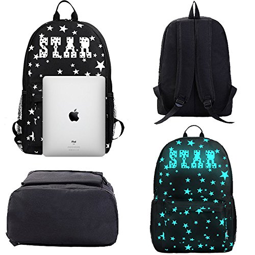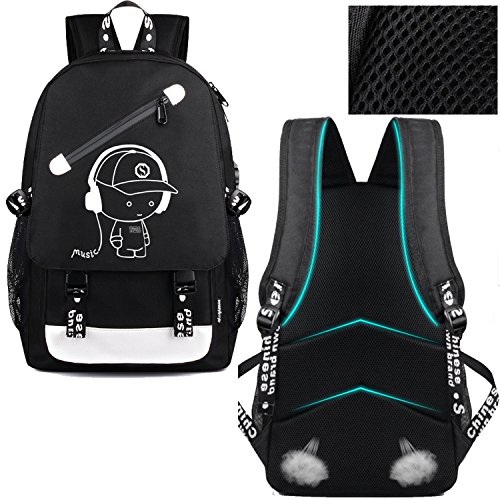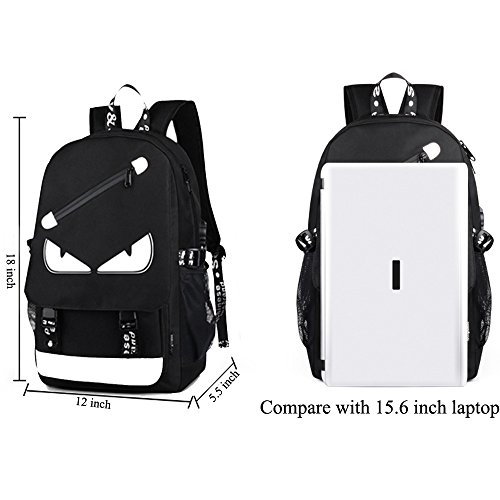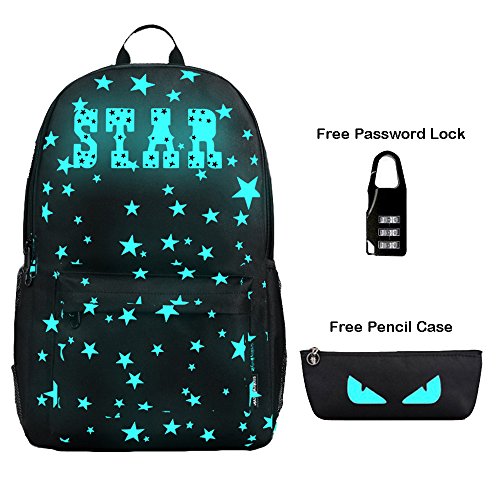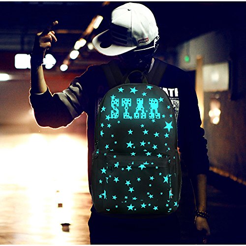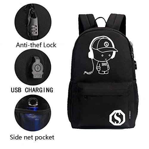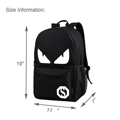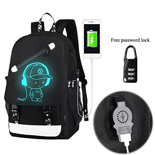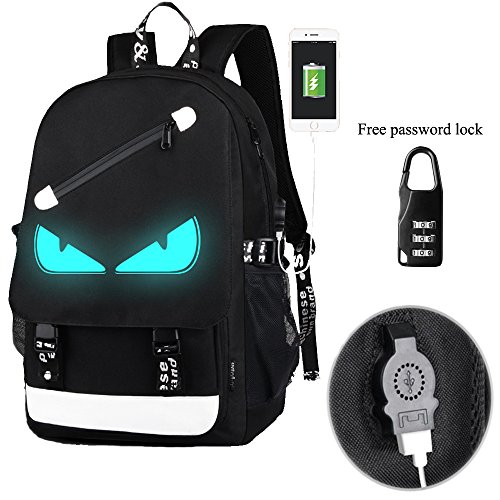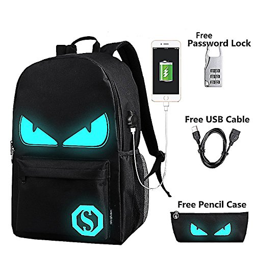 Luminous backpack, Super fashion USB charging port school bag , ANTI-THEFT Daypack,more attractive at night,Lightweight ,Durable,Roomy, Double zipper Whether you are traveling daypack or use as a school bag, laptop bag, this backpack is your best choice, let you stand out in a crowd with our trendy personality patterns backpack,This night light backpack is also the best choice for birthday gift Application:The Bookbag Perfect for outdoor activities like traveling,hiking,camping, fishing,shopping, weekend getaway, daily use, campus, sports,etc Features: Weight:0.93lb Backpack Size: 11*7*19inch Pencile Bag Size: 7.5*2.8inch Package Included: 1 * Backpack 1 * Luminous Pencil Bag 1 * USB Cable ( The portable charger is NOT included!! ) 1 * password lock Tips: The Logo's color is white during the day. In the natural light or light irradiates about 10-20 minutes can produce a good luminous effect, it could be maintained about 4-6 hours If the light is strong and lasts for a long time, the luminous effect and duration will be enhanced After absorbing light the color of the logo will glow in the dark as the picture shown