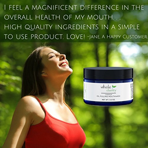 Whole Clarity Oil Pulling Mouthwash is the natural solution to whiter teeth, fresher breath, and superior vibrant health. You Get The Highest Quality Organic Oils in These Blends to Deliver The Best Results. Oil Pulling Has Been Clinically Proven to Whiten and Protect Your Teeth Naturally. Organic Virgin Coconut Oil Has Been Proven to Whiten Teeth Removing Years of Stains from Coffee, Wine, Smoking etc Without Toxic Chemicals of Whitening Kits. It Has Also Been Shown to Reduce Plaque and Help Prevent Tooth Decay. We Use the Highest Quality Organic Oils to Promote Vibrant Wellness Naturally. It is an Antiseptic Which Means That it Detoxifies The Body And Helps Prevent Bad Breath. This Ancient Ayurvedic Oral Hygiene Technique Rids the Body of Harmful Bacteria, Helps Prevent Tooth Decay, Clears Acne, Alleviates Allergies and Has Been Scientifically Supported to Improve Bad Breath in Halitosis Sufferers. Each and Every Bottle is Hand Crafted With Love and Care. If You Are Not Satisfied For Any Reason - You Will Receive a Full Refund Within the First 30 days. (We've Got a Feeling That You'll Enjoy it Though) Directions of Use: The Oil Pulling Mouthwash Becomes Liquid at 76 Degrees Fahrenheit (Please Open Mindfully in Warmer Environments) For Best Results, Use First Thing in the Morning. Scoop a Quarter-Sized Amount and Swish for UP TO 20 minutes. Even 1 minute will be effective. Dispose in the Garbage. Do NOT Swallow. This Oil Pulling Mouthwash is 100% Natural and Free of The Following Unsafe Chemicals Commonly Found in Mouthwash: Alcohol, Thymol, Hexetidine ,Methyl salicylate, Eucalyptol, Benzalkonium chloride, Cetylpyridinium chloride, Methylparaben, Hydrogen peroxide, formaldehyde (aka quaternium-15), fluoride, Saccharin, sodium lauryl sulfate, polysorbate, cetylpyridinium chloride and benzalkonium chlorideFeature