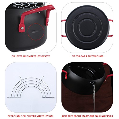 1,ELEGANT DESIGN: a oil dripper that hangs from the pot makes the tempura less oil and more crispy. The handles are cool touch. Oil level on the fryer body reminds you the suitable amount of the oil , won't make waste of the oil.