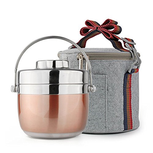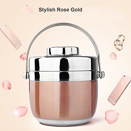 Round Stainless Steel Insulated Lunch Box Food Container 2-Tire with Thermos Bag,1.5L (Rose Gold)