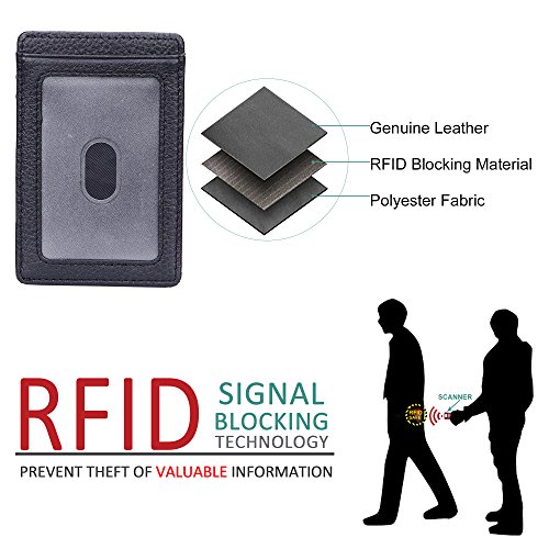 -. Feature : Made of Soft Embossed Full-Grain Leather, 3 card slot, 1 ID window, 1 Change/card Pocket, 1 magnetic clip for bills, very compact in your pocket. Wallet size: 4.3" x 2.8" x 0.1" (11cm x 7.1cm x 0.3cm); / Ultra Slim and minimalist: Fit Front/back pocket well, with snug card slots. Thumb hole in the ID window makes it easy to slip out ID. Slim profile, comfortable and works great. / Money clip, Made with 4pcs Powerful RARE EARTH Magnets, Magnetic clip works well with folded cash and is very strong to hold 30 bills, better than others with only 2pcs magnets. / RFID Blocking Function, protect your vital information from being stolen, allows your cards securely. Does Block 13.56 MHz Frequency (Credit cards, debit cards, driver license and ID cards). Does NOT Block 125 KHz frequency. / Great front pocket Wallet for Men, Holds plenty of cards and cash, compact, good stitching and durable.