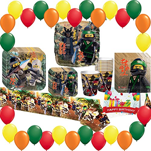 -. Feature : 8 L.E.G.O Ninjago lunch plates, 1 L.E.G.O Ninjago 18 Inch square mylar balloon / 16 L.E.G.O Ninjago lunch napkins, 7 Yellow 11 inch latex balloons / 8 L.E.G.O Ninjago paper cups 7 Red 11 inch latex balloons, 7 Green 11 inch latex balloons / 8 L.E.G.O Ninjago dessert plates, 7 Orange 11 inch latex balloons / 1 L.E.G.O Ninjago plastic table cover, 1 happy birthday card