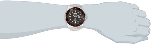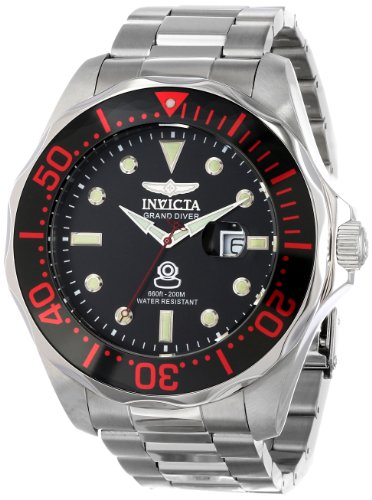 ReleaseDate : 2013-12-17 Studio : Invicta Publisher : Invicta Binding : Watch Product Description Stainless steel case with a stainless steel bracelet. Uni-directional rotating stainless steel bezel with a black top ring. Black dial with luminous hands and dot hour markers. Minute markers around the outer rim. Dial Type: Analog. Luminescent hands and markers. Date display at the 3 o'clock position. Quartz movement. Scratch resistant flame fusion crystal. Pull / push crown. Solid case back. Case diameter: 54 mm. Case thickness: 15 mm. Round case shape. Band width: 26 mm. Band length: 9 inches. Fold over clasp with safety release. Water resistant at 100 meters / 330 feet. Functions: date, hour, minute, second. Casual watch style. Invicta Pro Diver Black Dial Stainless Steel Mens Watch 14652. 0