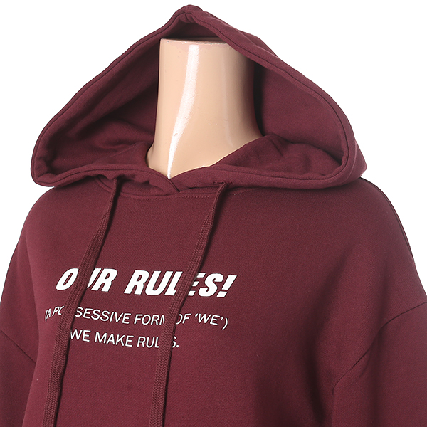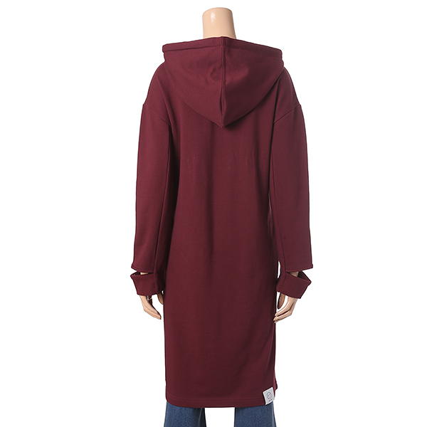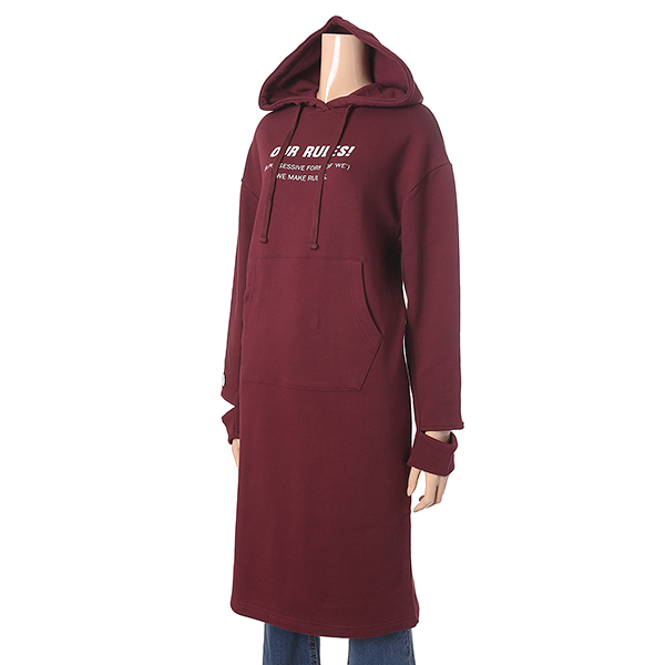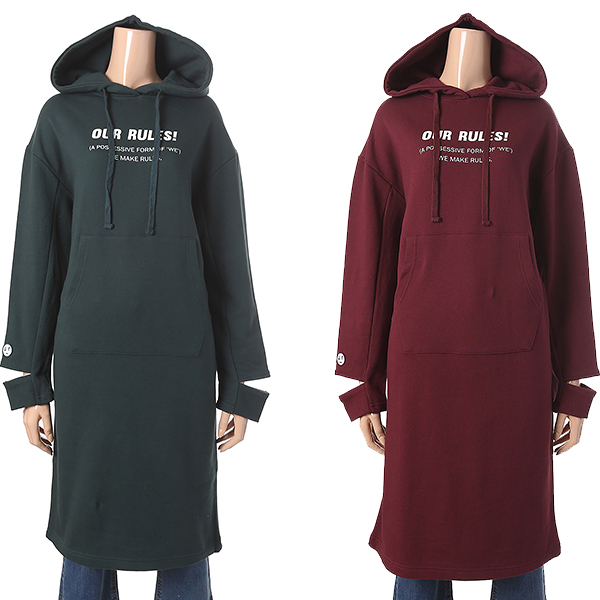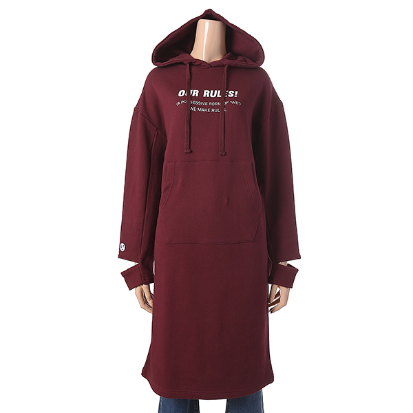 와인 컬러에 영문 레터링 장식으로 포인트를 준 원피스 입니다. 소매 트임으로 유니크하며 캥거루 포켓과 후드 장식으로 편안하게 착용할수 있습니다.