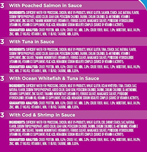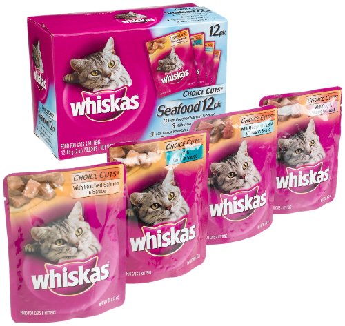 - Feature : Contains (4) 12-count boxes of 3-oz. WHISKAS CHOICE CUTS Seafood Selections Variety Pack Wet Cat Food, including With Poached Salmon in Sauce (3), With Tuna in Sauce (3), With Ocean Whitefish & Tuna in Sauce (3), and With Cod & Shrimp in Sauce (3) Flavors / Each pouch contains 8% crude protein to keep cats strong and healthy / WHISKAS CHOICE CUTS Cat Food is nutritionally complete and balanced for adult cat maintenance / Our FLAVOR-LOCK Pouch conveniently seals in flavor and juices to keep our cat food tasting fresh and delicious / Your cat will enjoy four paw-licking, protein-rich flavors in our CHOICE CUTS in Sauce Variety Pack: salmon, tuna, whitefish and tuna and cod and shrimp