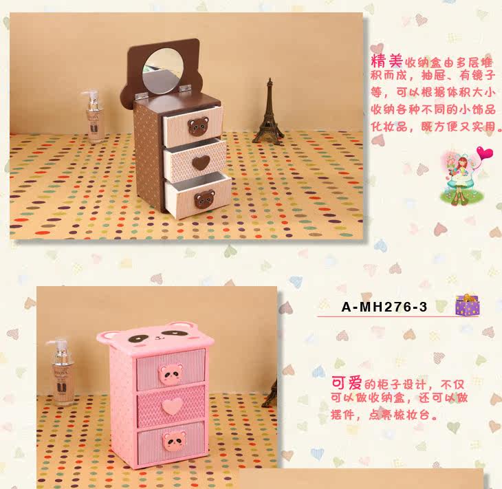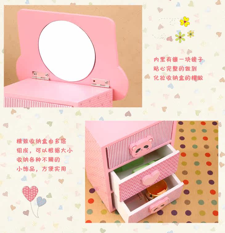 | Product Description | Using natural plant wood fiber and high pressure, environmental durability, product raw materials are carefully selected to ensure optimal product quality, stand the test. Beautiful storage box made of multiple layers, drawers, mirrors, etc., all parts are large enough capacity, according to the volume size, accommodating a variety of trinkets, cosmetics, convenient and practical. Easy to wipe the surface of the waterproof paint, environmental health, safety, non-toxic, consistent with national safety and environmental standards, care of your health. |