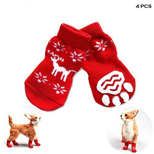 -. Feature : Pet Dog Socks Cute Cartoon Deer Dog Non-slip Warm Socks.100% Brand New and High Quality / Help senior dogs to walk on slippery floors without sliding. Protect your hardwood floors from nail scratches and quiet down your pet's footsteps / Long indoor socks will keep your pet's paws nice and warm. Adorable design for the holidays or everyday wear / Measure your pet's paw width for best fit. The breed, the weight or the size of your dog DO NOT determine the socks size. Please refer to the how-to instructions pictured. / NOTICE:1 Set x Pet Dog Socks (4pcs);1 X STAR-TOP GREETING CARD(PLEASE notice our package and the card,If u donot received the Brand card,CONTACT US,we will refund the money to you!)If u bought from other seller,we cant ensure the boots' quality