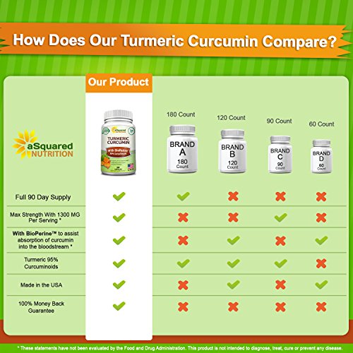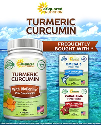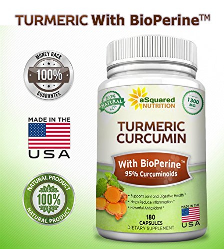 BEST VALUE AVAILABLE ON AMAZON: Backed by our 100% Money Back Guarantee, you receive 180 maximum strength capsules for a full 90 day supply. Our potent 1300mg formula delivers more value than the biggest names on Amazon touting only 900mg or 1000mg of Turmeric Curcumin per serving. Best of all, if you are dissatisfied with our product you have 30 days to return it for a full refund. Also try aSquared Nutrition's Resveratrol, CoQ10 400mg or our All Natural Ceylon Cinnamon (100% All Natural). *