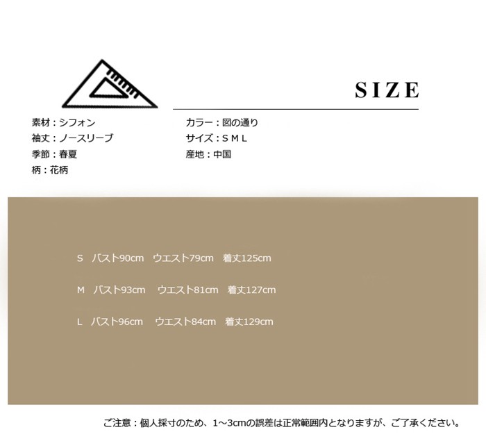 マキシワンピース 夏 レディース シフォンワンピース チュニック マキシワンピース 花柄 ノースリーブ ビーチワンピース 2018夏新作 マキシワンピース 花柄 夏 ロング丈 シフォンワンピース商品詳細素材:シフォン袖丈:ノースリーブ季節:春夏柄:花柄カラー:図の通りサイズ:S M L産地:中国サイズ参照表S バスト90cm ウエスト79cm 着丈125cmM バスト93cm ウエスト81cm 着丈127cmL バスト96cm ウエスト84cm 着丈129cmご注意:個人採寸のため、1~3cmの誤差は正常範囲内となりますが、ご了承ください。マキシワンピース 夏 レディース シフォンワンピース チュニック マキシワンピース 花柄 ノースリーブ ビーチワンピース 2018夏新作 マキシワンピース 花柄 夏 ロング丈 シフォンワンピース