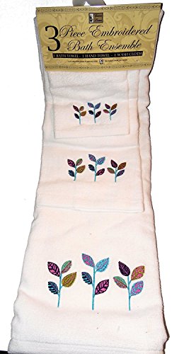 White with Colorful Leaves Design - 3 Piece Embroidered Bathroom Towel Set - Bath Towel, Hand Towel, Wash Cloth