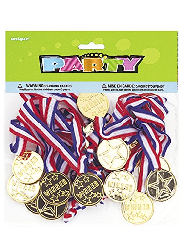 -. Feature : Package of 24 Gold Medal Party Favors / Plastic Gold Medals with the word "Winner" on a star pattern hang from red, white, and blue lanyards / A fun party favor for an Olympic themed party, sports theme party, or other kids birthday party / Plastic Olympic medals make great P.R.Izes for party games or field day competitions / Coordinate with other party supplies and birthday party favors