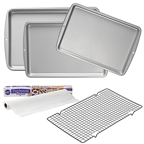 Value set that includes 3 non-stick cookie sheets, non-stick cooling rack, and Wilton parchment paper