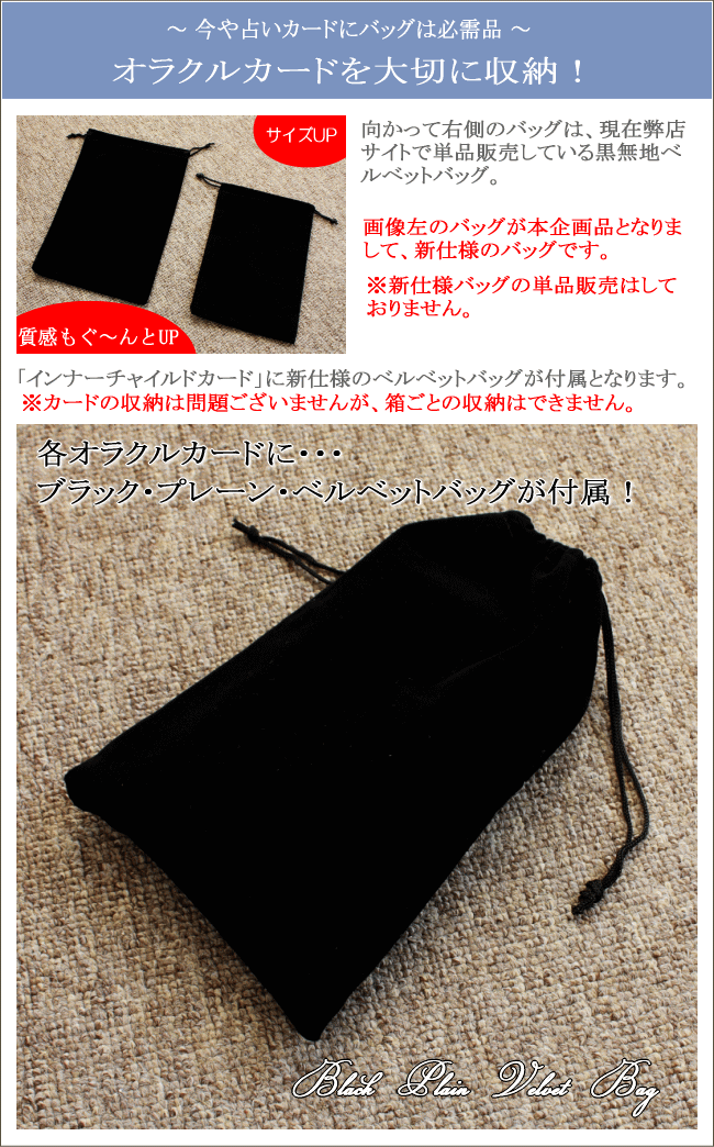 | オラクルカードに付属となりますポーチは単品販売しておりません。弊店では別のブラック・プレーン・ベルベット・バッグも販売していますが、そのバッグではサイズ的にインナーチャイルドカードの収納に適しておりません。 |