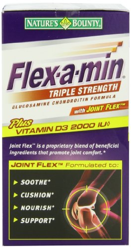 Studio : Nature's Bounty Publisher : Nature's Bounty Binding : Health and Beauty Product Description Nature's Bounty Flex-A-Min Triple Strength Glucosamine Chondroitin Formula With Joint Flex? Dietary Supplement Coated Tablets. 2 tablets per day! Plus, Vitamin D3 2000 IU MSM. Shows improvement in joint comfort in 7 days!1. Eases joint flare-ups*. Helps relieve occasional joint stiffness*. Glucosamine chondroitin MSM. Easy-to-swallow. 120 coated tablets. Individual results may vary. 0