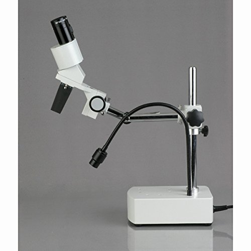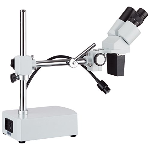 Professional stereo microscope with boom arm has long working distance to enables users to perform work or manipulate large items, including circuit boards and dental appliances