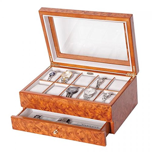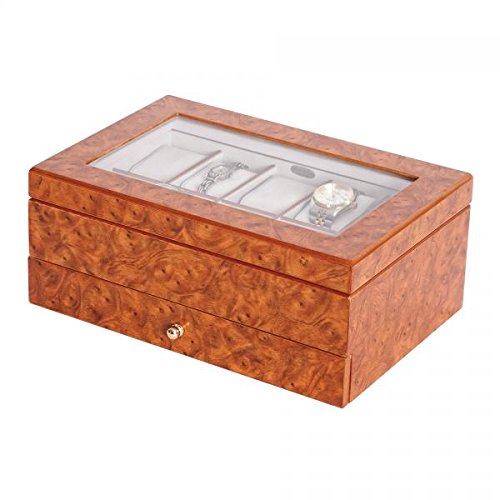 -. Title : Burlwood Oak Finish Wooden Watch, Jewelry Box. Glass Top, 10 Removable Watch Cushions, Bottom Drawer