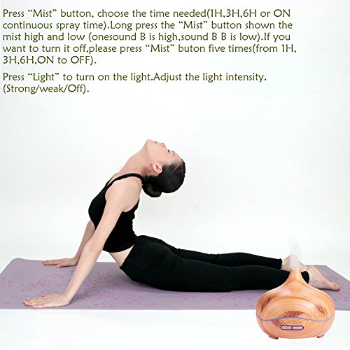 Time Setting and Mist Control:Comes with 4 timer settings(1H/ 3H/ 6H/ Continuous modes) and strong or weak mist options. In the cycle of the bottom features with 7 Adjustable Soothing LED Lights ,not overpowering ,work great as night light.