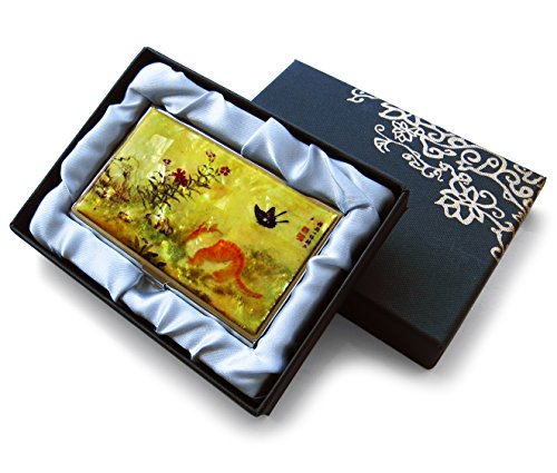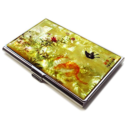 Business Credit Card Case Id Holder Metal Travel Wallet Mother of Pearl Flowers Cat Yellow