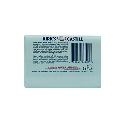 Kirk's Natural Original Coco Castile Soap Fragrance Free Description: All Natural Hypoallergenic Skin Care with No Animal By-Products or Synthetic Detergents Pure Botanical Coconut Oil Soap Ultra Gentle with No Drying Residue Since 1839, Kirk's Original Coco Castile Soap has given the consumer a high quality, all natural soap at an affordable price. Current national market research ranks Kirk's Original Coco Castile Soap as the top selling all-natural bar soap. "Castile" originally referred to the highly-prized vegetable based soap produced in Castile, Spain. For centuries this soap was considered "the soap of royalty" because of its luxurious lather and gentleness to the skin. Today, "Castile" refers to any vegetable based soap. Why ALL-Natural? No Animal By-Products Never Tested on Animals Hypoallergenic Biodegradable No Synthetic Detergents Free Of Synthetic detergents, animal by-products, added fragrances. Disclaimer These statements have not been evaluated by the FDA. These products are not intended to diagnose, treat, cure, or prevent any disease.Feature