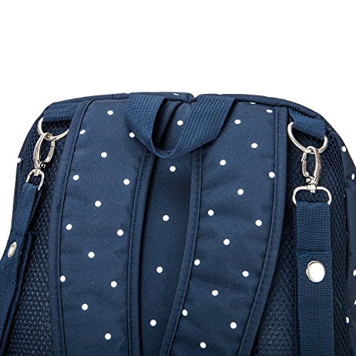 With choice of shoulder straps or easy tote carrying handle, this backpack is perfect for grab-and-go convenience. Large interior pocket includes individualized storage compartments and zip close pocket to safely organize baby's toys, burp cloths, apparel and more. Multiple exterior zippered compartments, insulated bottle pocket, and wipes dispenser provide quick access to items mom and dad rely on most to keep baby happy. When it's time for a diaper change, the removable changing pad makes it easy to keep baby dry no matter where parents may be.
