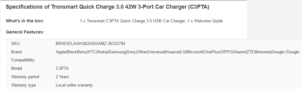 1 x Tronsmart C3PTA Quick Charge 3.0 USB Car Charger