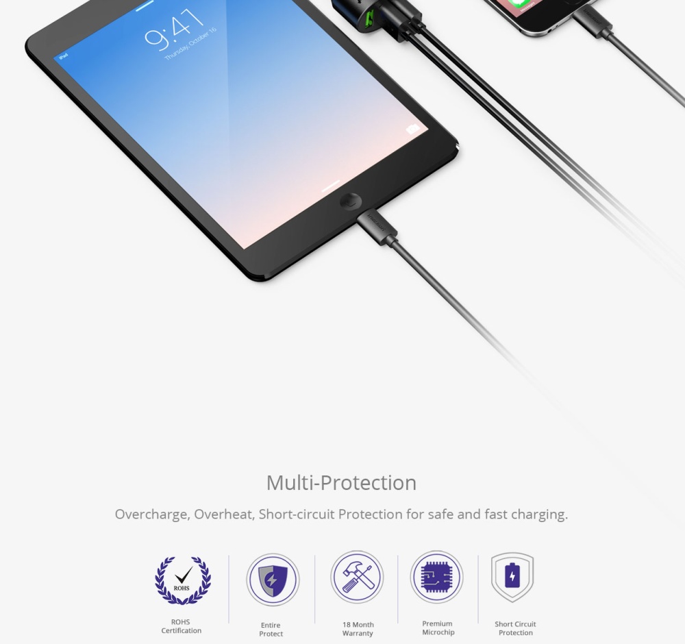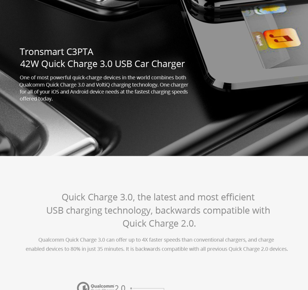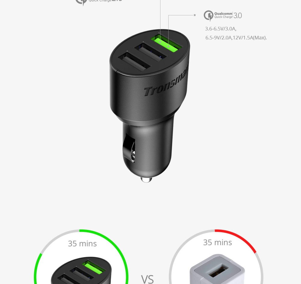 1. Only for Quick Charge 3.0 compatible device. You can get 27% faster charging speed compared with Quick Charge 2.0 Charger.