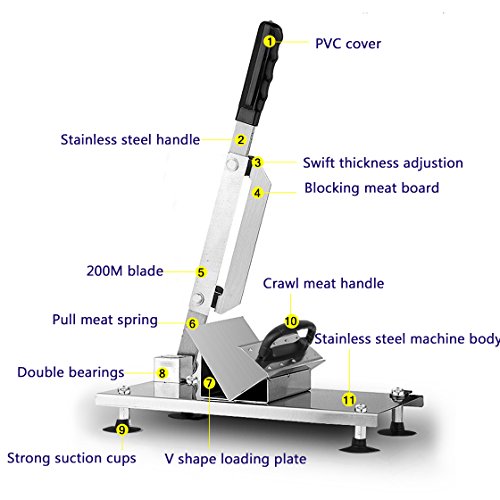 - Easy to operate: Manual meat slicer come with manual instruction, put the machine on the table, make the suckers stable immobilize the machine on the table, Grab the meat with your left hand, and use the handle with your right hand to slice meat into thin pieces, before using it, please read the manual carefully.
