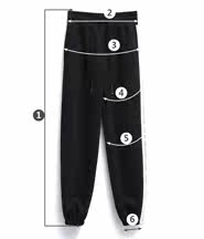 | 尺码 | ①裤长 | ②腰围 | ③臀围 | ④大腿围 | ⑤膝围 | ⑥脚围 | ⑦前裆 | ⑧后裆 | ||