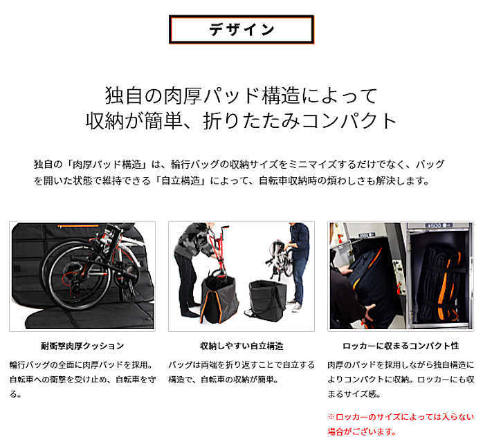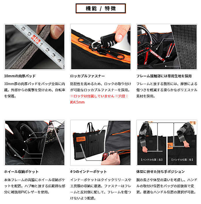 軽量コンパクトな輪行袋では得られない耐衝撃性を、肉厚パッドをバッグ全面に内蔵することで実現した自転車に優しい輪行キャリングバッグです。
