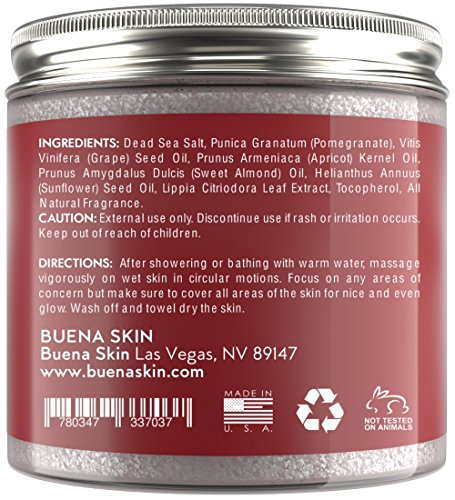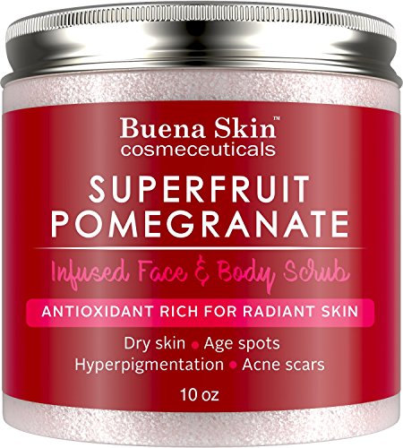 Pomegranate Brightening Face & Body Scrub, 10 oz by Buena Skin - Renews Your Skin's Youthful Radiance | Great For Dry Skin, Age Spots, Hyperpigmentation, Acne Flare-Ups and Acne Scars RENEW YOUR SKIN'S YOUTHFUL RADIANCE Bid farewell to signs of aging and say hello to fresh, radiant skin. Buena Skin's Superfruit Pomegranate Infused Face & Body Scrub creates a rejuvenating effect on elasticity, texture, and skin tone. ORGANIC POMEGRANATE RICH IN VITAMIN A, VITAMIN C AND IRON Pomegranate offers amazing skin benefits. It's rich in anti-oxidants, which destroy free radicals, and packed with vitamins and minerals that are brimming with anti-aging properties. TREATS DRY SKIN, AGE SPOTS AND MORE This scrub deeply penetrates the skin for effective treatment of dryness and reduces age spots, puffiness and redness. It also helps regulate sebum production for better acne control, and minimizes acne scarring. SUITABLE FOR FACE AND BODYFeature
