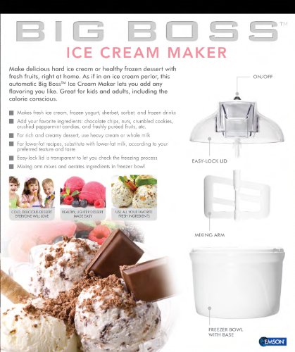 The Big Boss 1.5L Ice Cream Maker lets you enjoy fresh tasting homemade ice cream and favorite frozen dessert. Make delicious hard ice cream or healthy frozen dessert with fresh fruits right at home. As if in an ice cream parlor, this automatic Big Boss Ice Cream Maker lets you add any flavoring you like. Great for kids and adults, including the calorie conscious.Feature