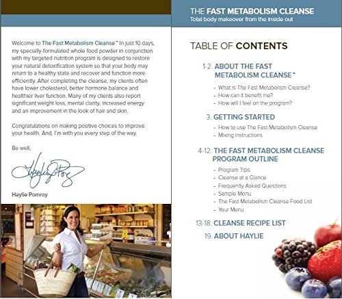 -. Binding : Health and Beauty -. Brand : Haylie Pomroy -. Feature : The same formula used by Haylie's celebrity clients / Great tasting and satisfying / Lose up to 10 pounds in 10 days / Includes 3 tubs of Haylie's Cleanse Shake / Includes shaker bottle and program guide -. IsAdultProduct : 0 -. Label : Haylie Pomroy -. LegalDisclaimer : Children and pregnant or lactating women should consult their healthcare practitioner prior to use. Do not use if tamper seal is damaged. Consult your healthcare practitioner before use especially if you are receiving cancer treatment or taking an anticoagulant. Do not take if you are pregnant or lactating. -. Manufacturer : Haylie Pomroy -. MPN : HPGA1008 -. PackageQuantity : 1 -. PartNumber : HPGA1008 -. ProductGroup : Health and Beauty -. ProductTypeName : HEALTH_PERSONAL_CARE -. Publisher : Haylie Pomroy -. Studio : Haylie Pomroy -. Title : Haylie Pomroy's 10-Day Fast Metabolism Cleanse Program